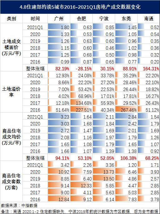 2016年到2021年1季度,广州土地成交楼面价从0.99万元/平上涨到1.80万元/平;同期南通土地成交楼面价从0.20万元/平上涨到0.52万元/平。