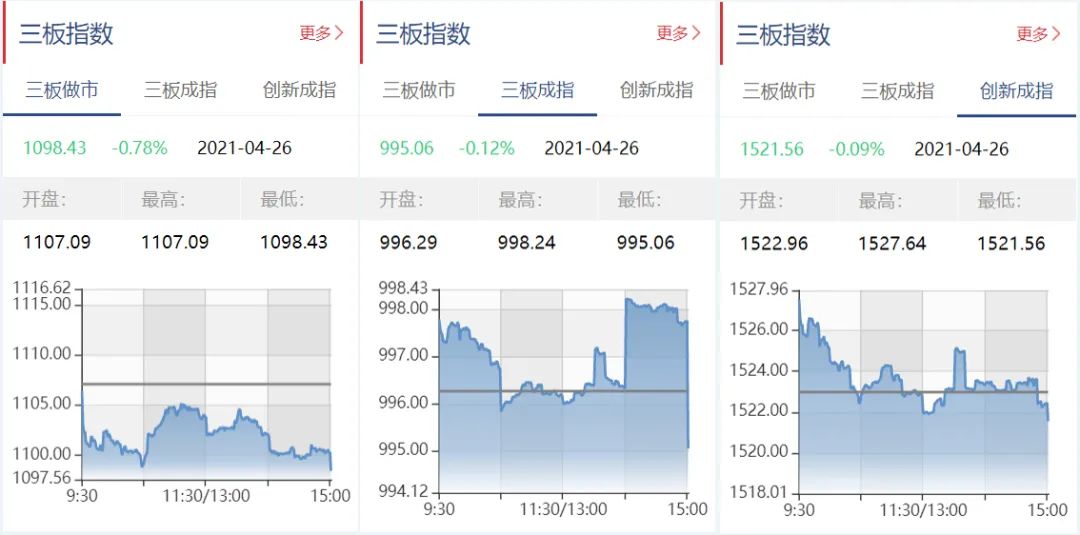 截至4月26日收盘,三板做市报1098.43点,下跌0.78%;三板成指报995.06点,下跌0.12%;三板创新报1521.56点,下跌0.09%。