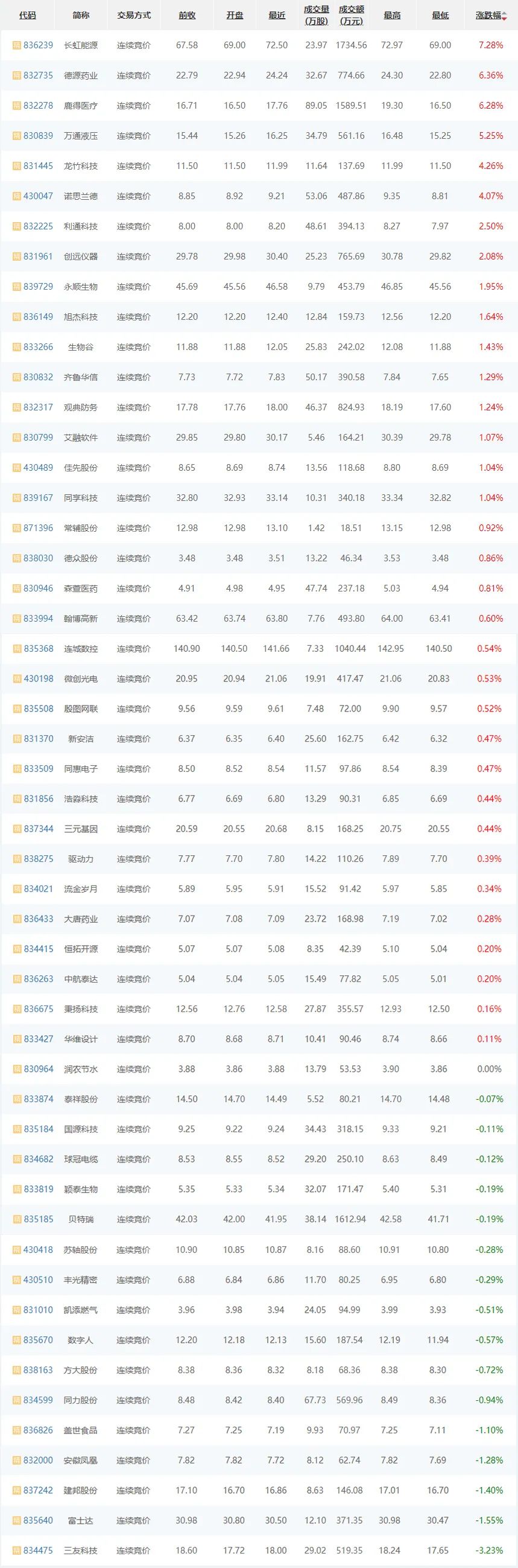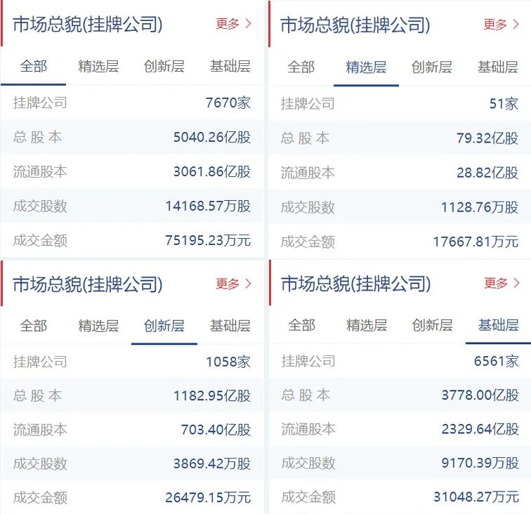 截至4月26日收盘,今日成交金额为7.52亿元,精选层成交金额为1.77亿元,创新层成交金额为2.65亿元,基础层成交金额为3.10亿元;今日成交股数为14168.57万股,精选层成交股数为1128.76万股,创新层成交股数为3869.42万股,基础层成交股数为9170.39万股。