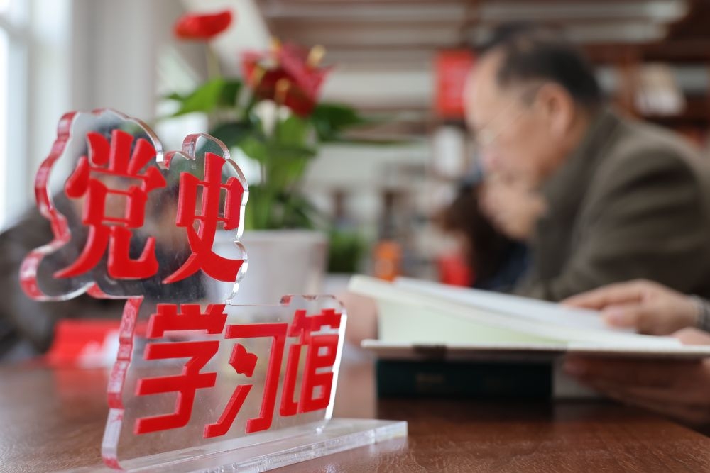 ↑2021年3月16日,人们在河北黄骅市骅中街道信誉楼社区党史学习馆学习党史。