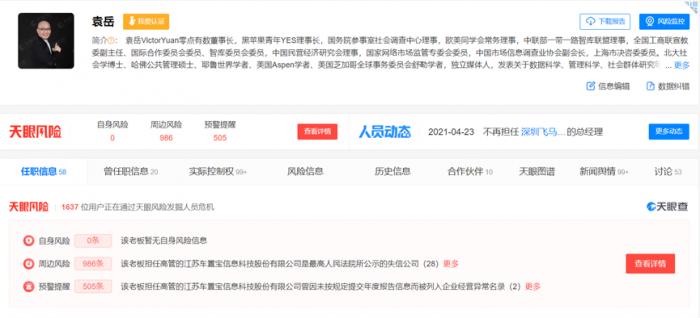 零点有数招股书透露称,飞马系参投并提名董事的公司车能贷在报告期内存在重大违法违规行为。车能贷作为P2P平台在2020年2月因犯非法吸收公众存款罪,被依法处以刑事处罚,至今仍有6000多万元欠款未还清。爆雷之前,袁岳还曾允许车能贷使用其肖像进行市场推广和宣传活动,并多次为其站台宣传。