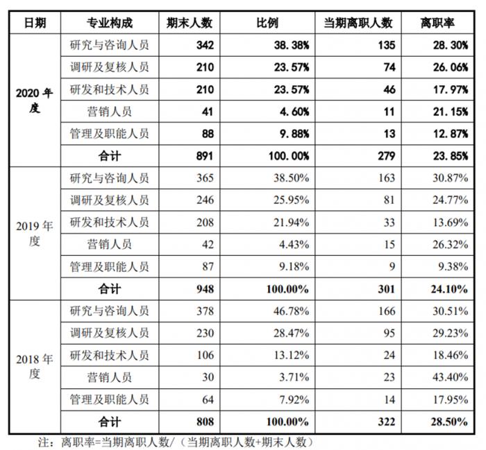 零点有数报告期的员工总数分别为808人、948人和891人,整体离职率分别为28.50%、24.10%和23.85%。公司研究与咨询人员的人数在报告期分别为378人、365人和342人,每年的离职率分别为30.51%、30.87%和28.30%,离职率更是高于公司平均离职率。