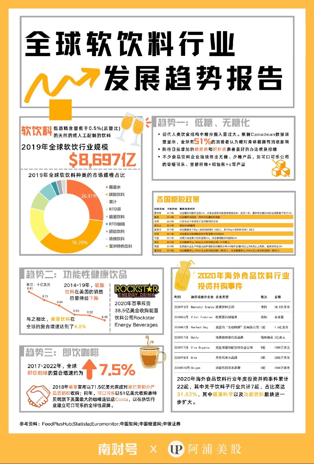 2018年,行业内发生了多起与咖啡公司相关的并购项目。据估计,2017-2022年全球即饮咖啡的复合增速约为7.5%。