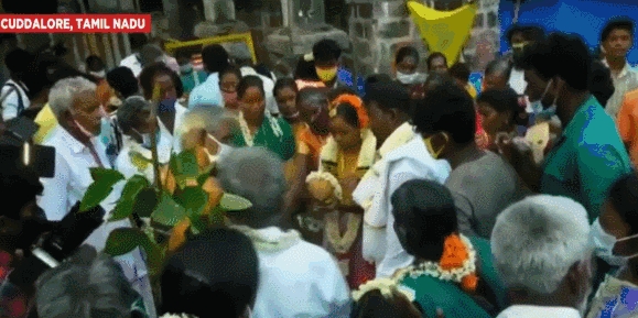 据《今日印度》25日报道,印度泰米尔纳德邦新冠肺炎确诊病例不断攀升,当地政府24日发布更严格的防疫新规,禁止民众进入礼拜场所。然而,多对夫妇违反新规,竟在寺庙入口处街边举行婚礼,很多到场亲友不戴口罩聚集。
