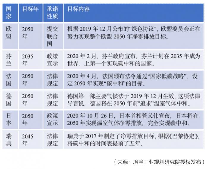 据冶金工业规划研究院整理,部分国家碳中和目标列表如下。