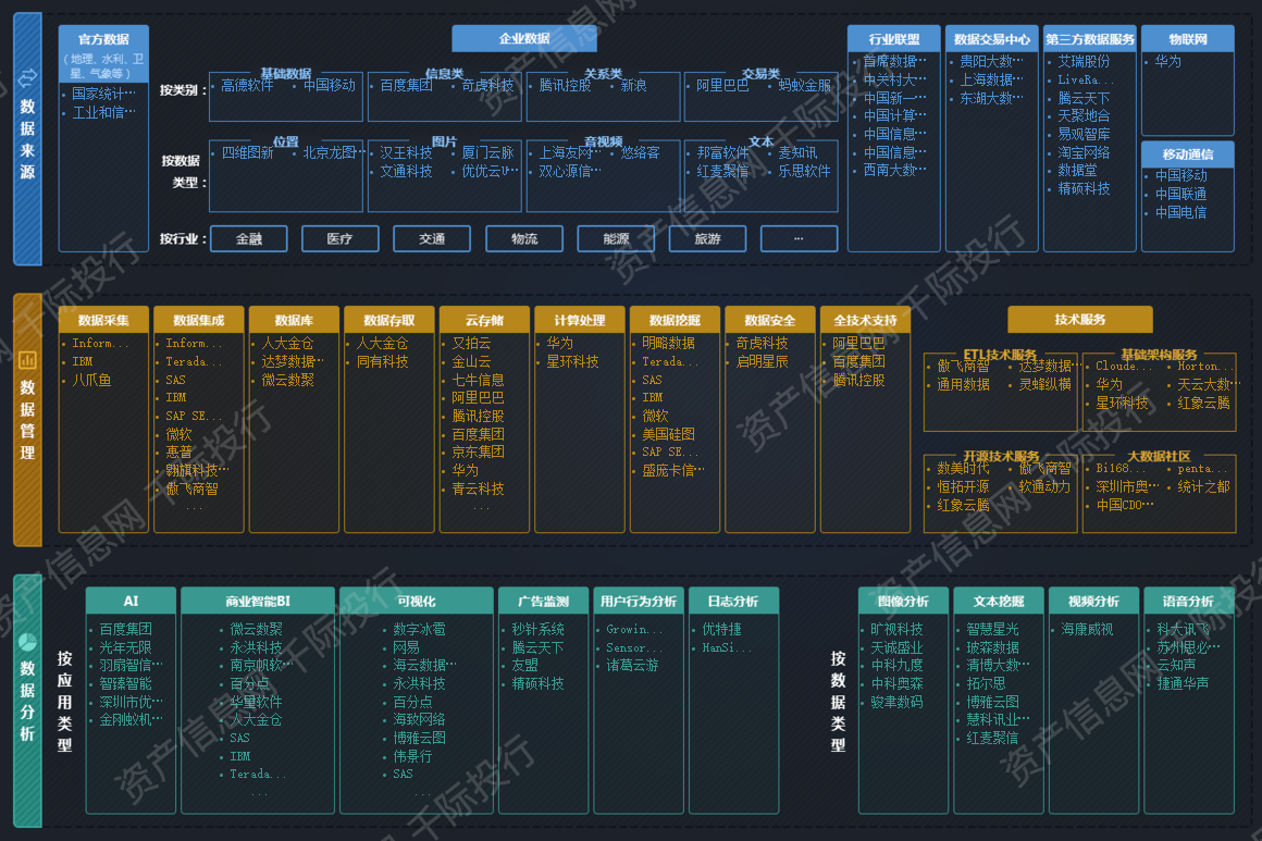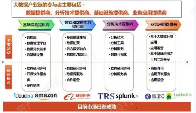 大数据产业链的参与者主要包括:数据提供商、分析技术提供商、基础设施提供商、业务应用提供商。