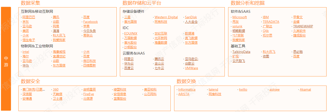 大数据存储与管理的主要参与者以传统数据库企业为主,国际上主要有IBM、Oracle、Intel、Green-plum、Informatica Cloudera等;国内主要有中兴、华为、用友、浪潮、托尔思、数据堂、九次方、亿赞普、达梦等。各家企业针对大数据应用开展各具特色的数据库架构和数据组织管理研究,形成针对具体领域的产品。