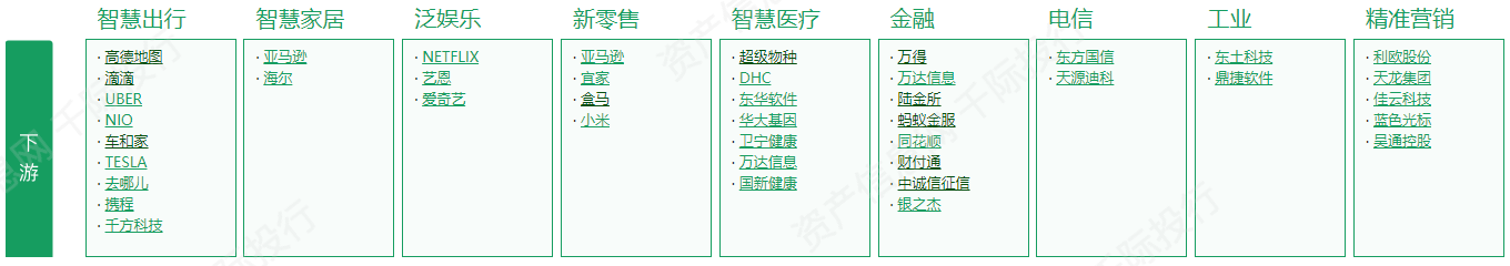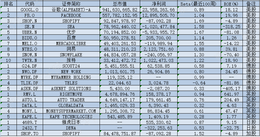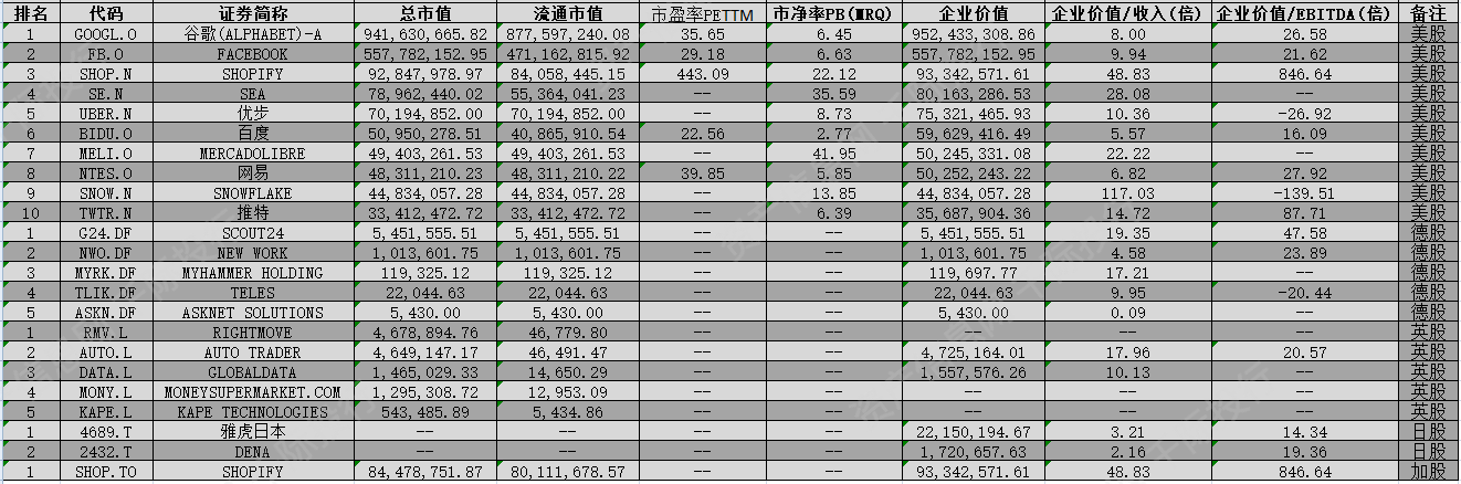 全球非中国主要企业有谷歌(ALPHABET)-A[GOOGL.O]、FACEBOOK[FB.O]、SHOPIFY[SHOP.N]、中国主要企业有百度[BIDU.O]、MERCADOLIBRE[MELI.O]、网易[NTES.O]、SNOWFLAKE[SNOW.N]、推特[TWTR.N]、SCOUT24[G24.DF]、NEW WORK[NWO.DF]、MYHAMMER HOLDING[MYRK.DF]、TELES[TLIK.DF]、ASKNET SOLUTIONS[ASKN.DF]、RIGHTMOVE[RMV.L]、AUTO TRADER[AUTO.L]、GLOBALDATA[DATA.L]、MONEYSUPERMARKET.COM[MONY.L]、KAPE TECHNOLOGIES[KAPE.L]、雅虎日本[4689.T]、DENA[2432.T]、SHOPIFY[SHOP.TO]等。