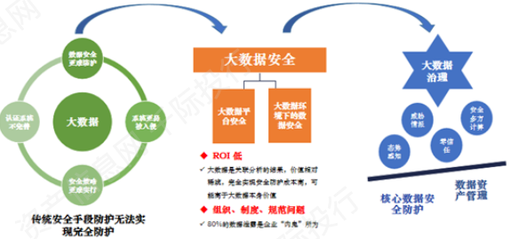 传统数据安全已经无法满足大数据场景下的安全防护要求。大数据时代,数据的获取方式、存储规模、访问特点、分析方法和技术架构都有了很大不同,与此同时,企业的组织架构和业务流程也相应发生了转变,这些新特征对于数据安全提出了全新挑战——数据安全更难防护、认证系统不完善、系统更易被入侵、安全策略更难实行等。未来大数据安全将逐步从重安全技术转变为重治理,其重点落在核心数据资产的梳理和防护,以及围绕大数据治理所开展的体制机制建设。