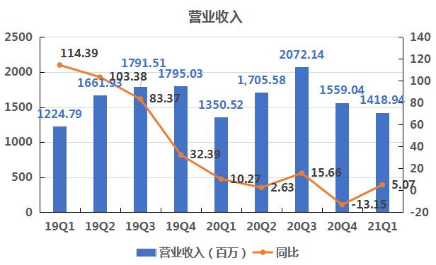2021年一季度,汇顶科技实现收入14.19亿元,同比增长5.07%,归属上市公司股东净利润为1.57亿元,同比下降23.51%,归属净利润扣非净利润1.3亿元,同比下降27.66%。