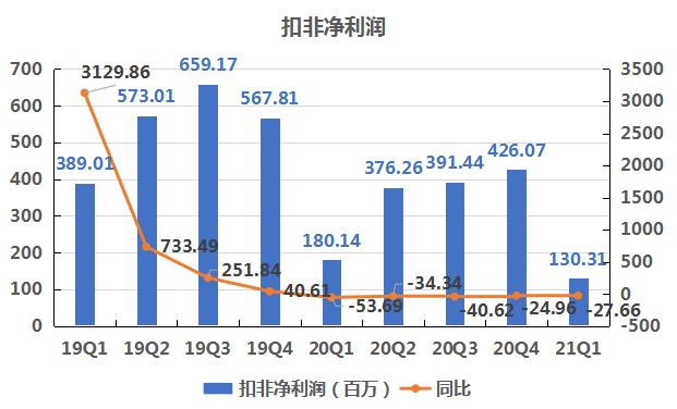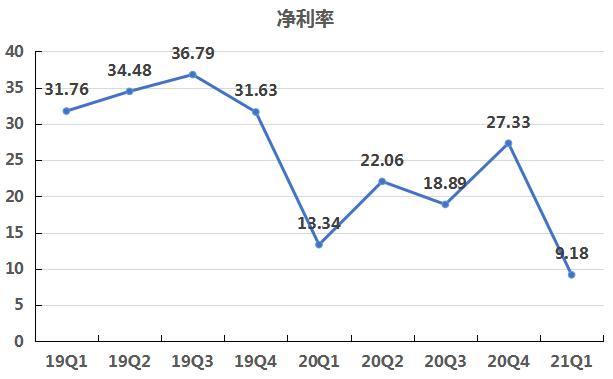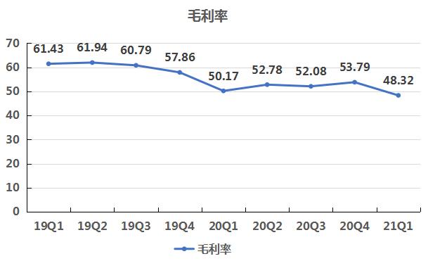 净利润负增长,其中一部分的原因在于毛利率的变化情况。由上可知,自2020年以来,公司的毛利率水平整体下降了一个层次,由2019年60%左右下降到2020年50%左右。到了2021年一季度,毛利率持续下滑,为48.32%。