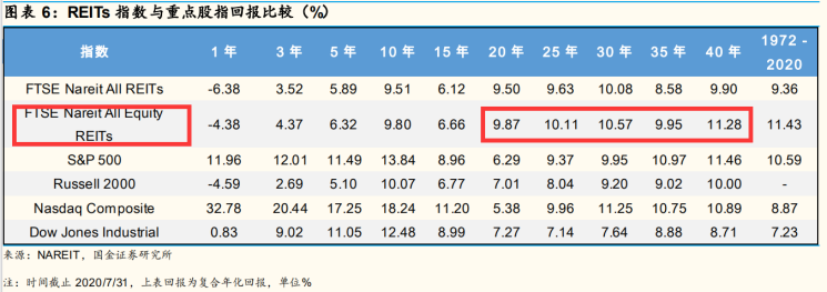 以20-40年为考察周期,美国权益类REITS的长期年化回报超过10%,和标普500指数不相上下,相当优秀。
