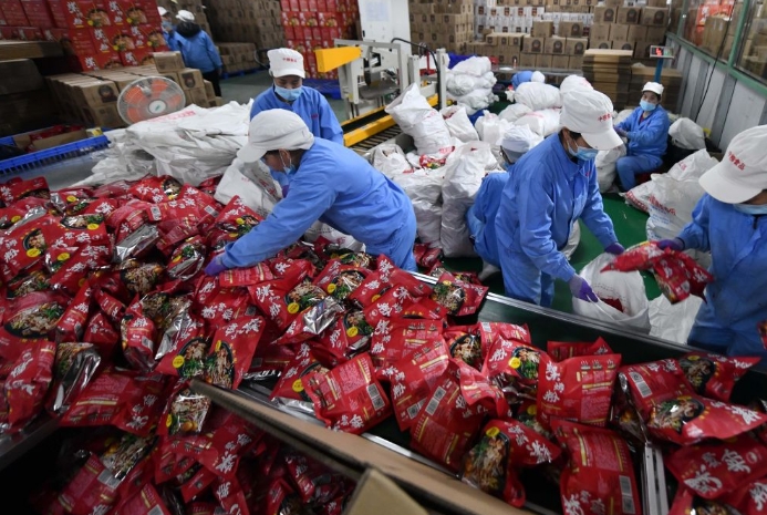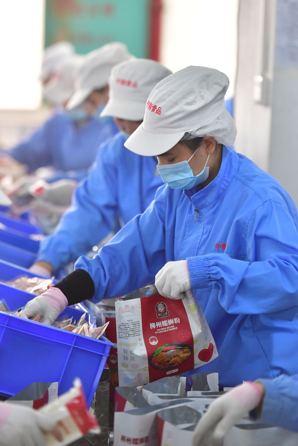 在柳州市螺蛳粉产业园广西中柳食品科技有限公司生产车间,工人在生产线上包装螺蛳粉(2月2日摄)。新华社记者黄孝邦摄