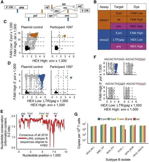 具体而言,测定方法1的三个HIV靶点位于HIV pol基因的3'端、tat基因和env基因,而测定方法2的三个HIV靶点位于长末端重复序列(LTR)/gag区域、pol基因的5'端和env。每种测定方法中,针对每个HIV靶点设计特异性的引物和探针。在每种测定方法的三个HIV靶点中,有两个使用相同的染料进行探针检测,但浓度不同,以便能够在荧光振幅的X/Y图上区分不同的HIV靶点。这使得这些作者能够对含有不同靶点组合的液滴进行定量确定。针对env的引物和探针在测定方法1和测定方法2中是相同的,在201个临床样本中,这两种测定方法的env性能几乎相同。此外,在这些临床样本中,五对引物/探针检测靶点的失败率极低:gag 0.5%;3' pol 1%;env 3.1%(两种测定方法均如此);tat 3.6%;5' pol 6.3%。