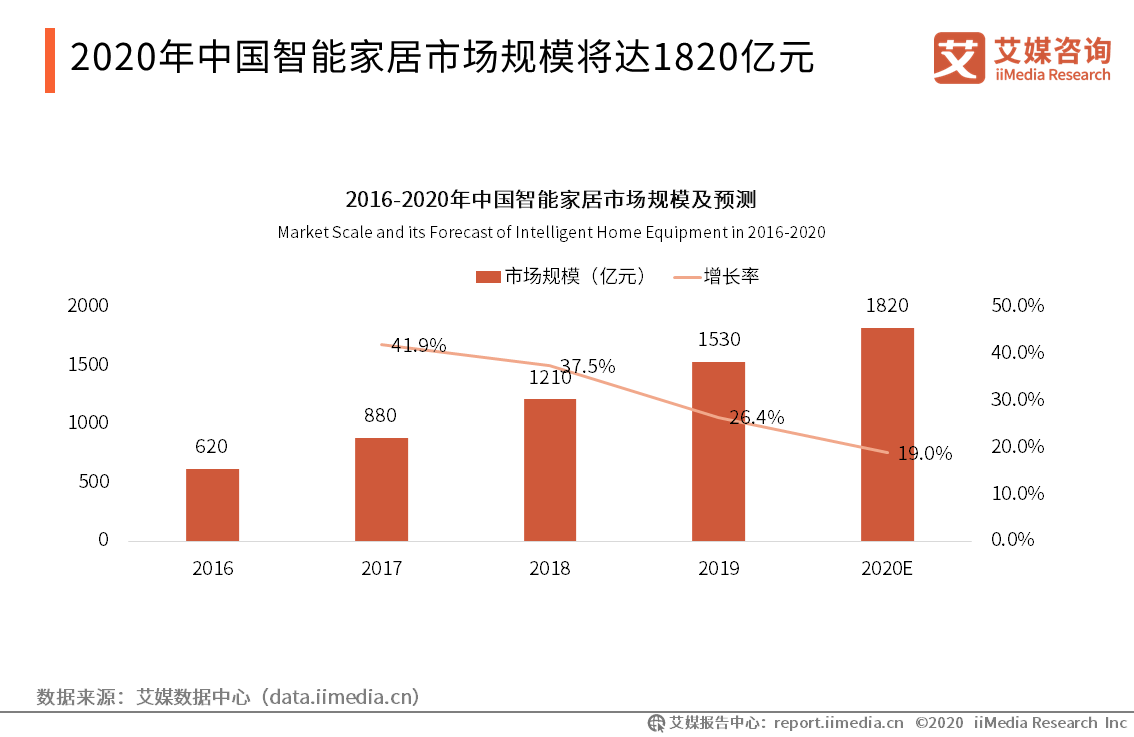 据艾媒咨询数据显示,2016-2020年,中国智能家居市场规模持续扩大,2020年中国智能家居市场规模同比增长11.4%至1705亿元。随着互联网家装市场渗透率的提高,预计到2022年将突破2000亿元。