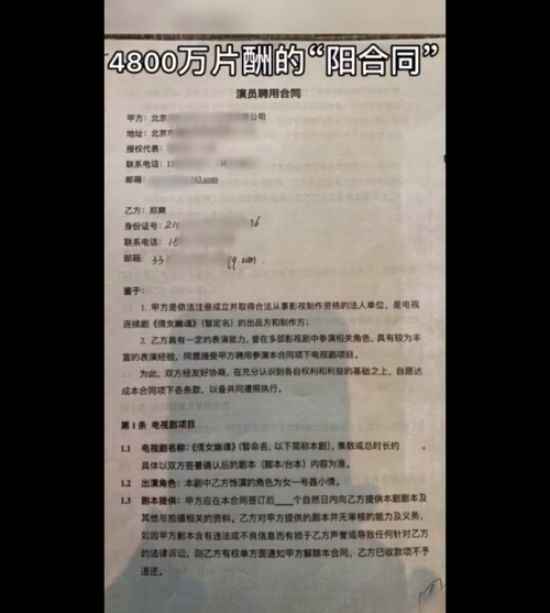 4月26日,女艺人郑爽的前男友张恒再发猛料。在他微博所公布视频中,直指郑爽通过阴阳合同在《倩女幽魂》项目中获得收入1.6亿元,按77个工作日计算,日薪超208万元。值得注意的是,这一数字远超业内5000万元限薪门槛,且存在种种偷漏税行为。