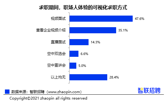 疫情期间,求职者对快捷、方便、安全的追求催生了可视化求职方式的新一轮迭代,“隔屏相见”的连接方式获得越来越多企业和求职者的认可。调研数据显示,47.6%的职场人都进行过视频面试,35.1%的白领表示查看过企业视频介绍,还有14.3%尝试过直播面试这一最新求职形态。