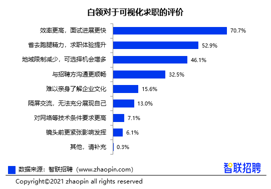 就可视化求职体验,超过7成的受访白领人才认为效率更高,助推面试进展更快,52.9%的白领表示省去跑腿精力,大大提升了求职体验,“地域限制减少,可选择机会增多”、“与招聘方沟通更顺畅”也成为高票选择。