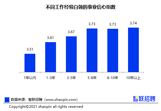 工作经验不足一年的职场新人事业信心指数为3.51,在所有经验白领中为最低。由于初入职场时,职业规划、事业发展尚未明朗,职场萌新们在“摸着石头过河”的过程中不免怀疑自我,信心不足。而积淀更丰富、羽翼更饱满的白领对事业也更具自信,工作五年以上的白领取得事业成就的信心指数达到3.73。对于资历尚浅的白领来说,在积累经验的同时,应快速融入社会生活,并找到自己前进的方向,建立自信心。