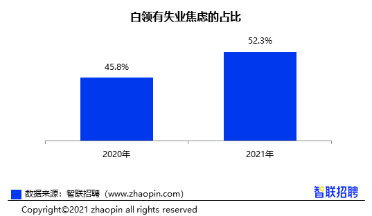 在白领跳槽成功率上升的同时,52.3%的白领仍在为失业风险而担忧,较上一年的45.8%扩张6.5个百分点。