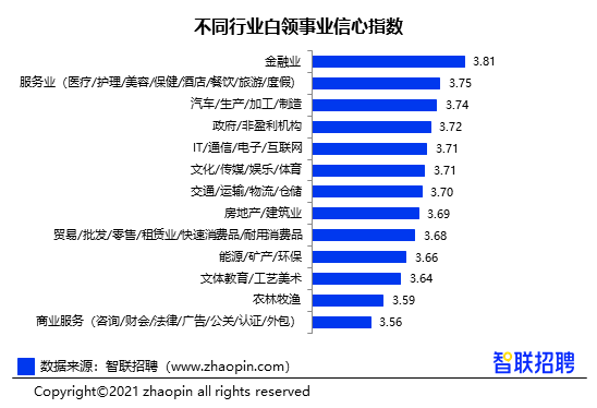 从行业角度来看,对于2021年事业发展最具有信心的是金融业,以3.81的事业信心指数领跑全行业。然而,金融人才去年春季事业信心还处于垫底,一年内却成功“逆袭”,这与股市行情向好、市场中投资理财行为增加带动金融业景气上涨不无关系,同时也体现了我国金融体系的稳固与创新趋势让行业人才充满希望。