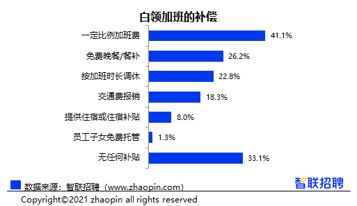针对超过正常劳务时间的加班,41.1%的企业会给予一定比例的加班费,26.2%提供免费晚餐/餐补,按加班时长调休也是较为普遍补偿方式,占比22.8%。然而,仍有33.1%白领的加班行为为“义务劳动”,并无任何补贴。