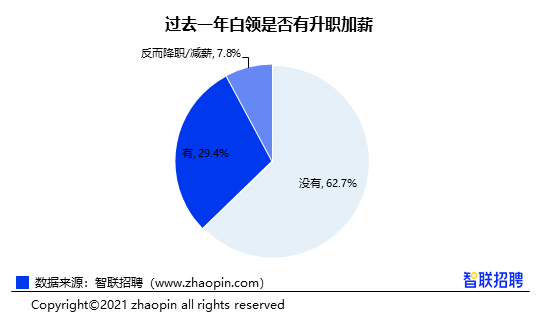 工作强度上升也为部分白领带来收获。过去一年中,29.4%的白领获得升职加薪,而7.8%反而遭受职级下降或减薪;事业发展原地踏步的人数占比则最高,达到62.7%。