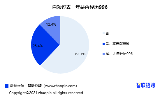 过去一年,有37.8%的白领经历过996,其中25.4%本身就处于996工作状态,还有12.4%从去年开始才开始996。