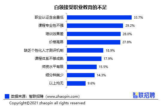 虽然职场人对职业教育高度重视,但目前市场上的职业教育仍存在提升空间。其中,33.7%的白领认为职业认证含金量低,而“课程专业性不强”、“培训效果差”、“价格高昂”也成为职业培训主要弊端。“职场考证热”下各类认证与培训层出不穷,但由于欠缺筛选机制,培训者想达到就业增值效果往往很难。