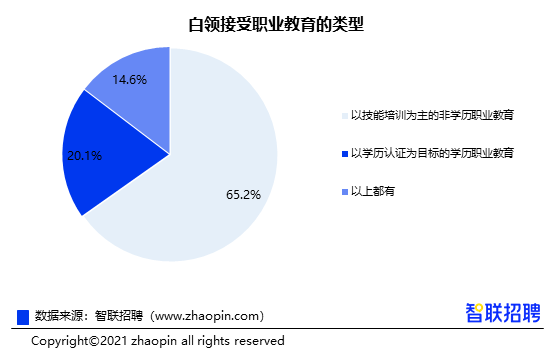 据调研数据显示,过去一年,43.7%的白领都接受了职业教育或培训。从职业教育的类型来看,以技能为主的非学历职业教育占到65.2%,是学历职业教育的三倍有余,还有14.6%的白领同时接受了两种类型的职业教育。当下我国人口红利向人才红利转型,同时劳动力市场的高等教育较为普及,这也意味着学历价值被稀释而专业技能成为核心竞争力,本次调研结果也侧面佐证了这一职场趋势。