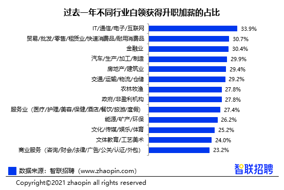 IT互联网行业白领升职加薪比例最高,为33.9%