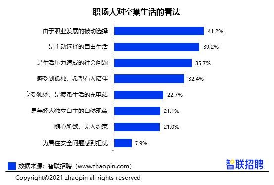 除了选择生活方式的出发点不同,空巢生活也体现了职场人分化的生活态度。35.7%将空巢生活上升为对社会问题的反思,还有32.4%感受到孤独,希望有人陪伴。另一方面,22.7%表示空巢生活是疲惫生活的充电站,21.1%认为是年轻人独立自主的自然现象,21%更是热爱这种随心所欲,无人约束的生活。