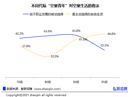 然而,从代际差异的角度来看,在70后、80后与90后的空巢青年中,“被动选择”的占比都高于“主动选择”,其中80后的选择差距最明显、90后最为接近。而95后对于这两选项则有所反转,44.8%主动选择独居生活,由于工作被迫“空巢”的占比35.5%,可见以90后为分水岭,职场萌新们对于单身独居生活更多的是主动拥抱。