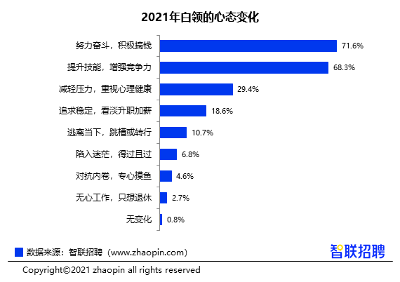 2021年,大多数白领的心态都有所调整,“积极进取”为主旋律,选择“努力奋斗,积极搞钱”和“提升技能,增强竞争力”占比最高,分别为71.6%和68.3%。另外,也有白领决定放慢脚步,29.4%想减轻压力,重视心理健康,还有18.6%则以追求稳定为主,看淡升职加薪。