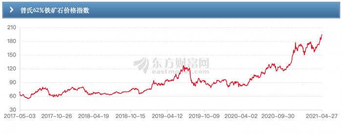 近期,铁矿石、铜、铝等基本金属行情向好。4月27日最新数据显示,普氏62%铁矿石价格达到193.85美元/吨,在继续刷新今年的价格记录,创十年新高。