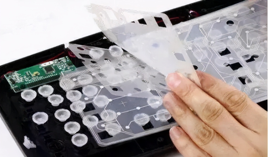 与之相对,薄膜键盘用一张硅胶薄膜代替多个机械开关,通过硅胶碗和金属碗直接触击PCB板产生数字信号。加工和组装难度较低,价格也比机械键盘便宜许多。