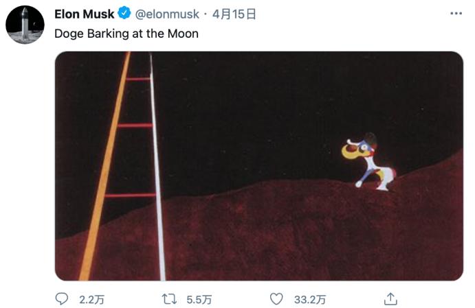 4月初,马斯克在社交媒体上表示将使用SpaceX把一枚狗狗币带到月球上。消息一出,狗狗币直线拉升,当天大涨15%。