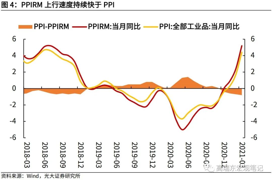 另一方面,企业运营效率明显提升,单位成本同比下降,利润率上升。2021年1-3月,规模以上工业企业累计营业收入利润率为6.64%,同比提高2.76个百分点,比2021年1-2月提高0.04个百分点,利润率达到历史较高水平。同时,从PPI走势来看,2021年3月PPI和PPIRM均保持继续上行的趋势,同比分别上涨4.4%和5.2%,相比于2021年1-2月,均有显著增高。PPIRM上行速度依然快于PPI,原材料价格的上升仍然持续,推动上游企业利润持续提升。