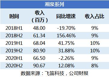 湘泉系列,是酒鬼酒的低端产品。在2020年上半年,这块业务也受到了一定的影响,出现负增长,下半年收入回升,增速为12.08%,但远不及2019年的同期水平。