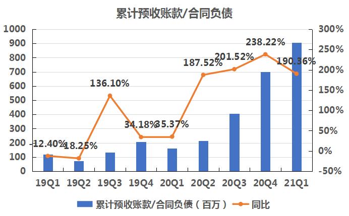 上图是公司的预收账款(2020年开始会计科目口径改为“合同负债”),从中可以看到,公司的预收账款自2020年二季度起便快速增长,三、四季度,同比增速达到200%以上的水平。