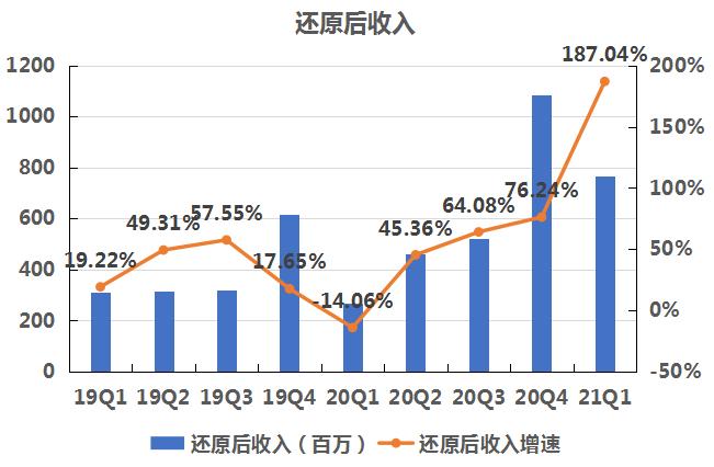 上图是公司经还原后的收入及收入增速,从中可以看到,公司一季度营业收入还原后是下降了14%,下降幅度比财报显示的要大,但随后三个季度收入增速快速增长,四季度增长了76.24%,比财报中显示的要好,2021年一季度继续上扬。