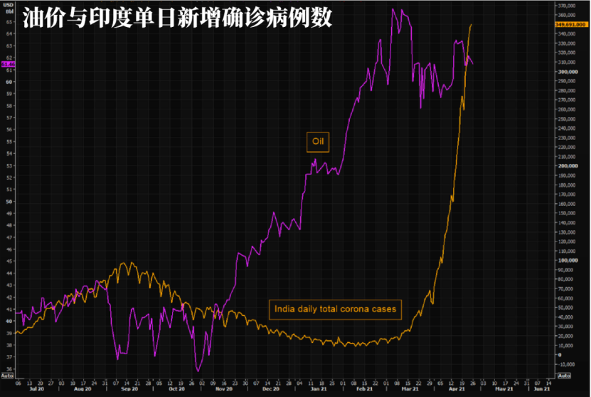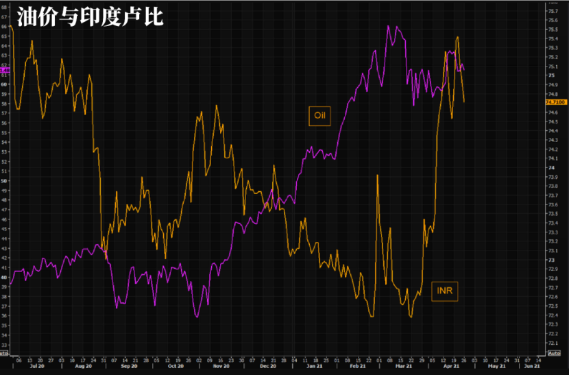 油价在3月早些时候达到峰值,但此后一路走低。也许这只是一个巧合,但自从印度确诊病例数开始攀升,油价就停止上涨了,卢比也明显遭受到了巨大的打击。