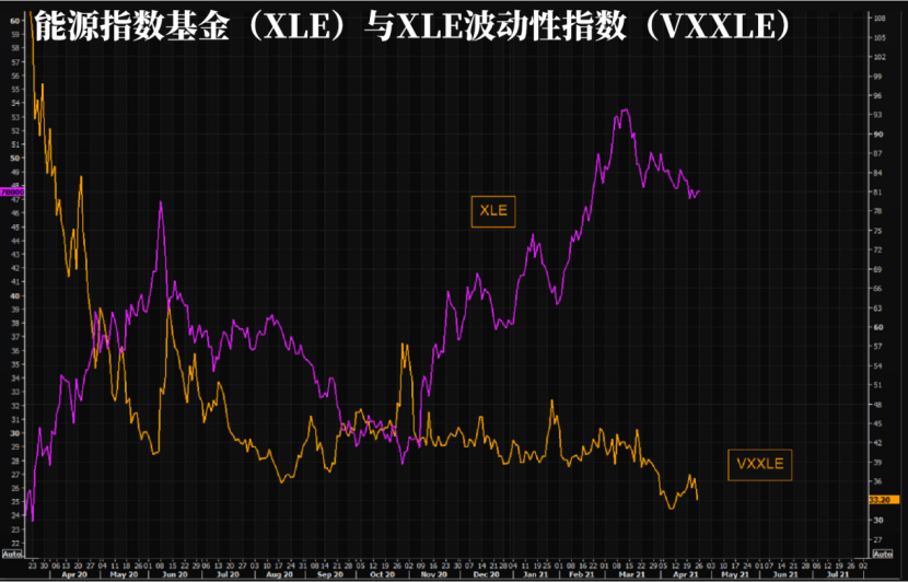 尽管XLE表现不佳,但XLE波动性指数(VXXLE)相较于低点却有所升高,不过最近略有走低。如果印度疫情对石油需求造成负面冲击,那么最终受益的可能就是OVX和VXXLE指数。金融博客零对冲认为,在当前水平做多XLE波动率将会非常有趣。