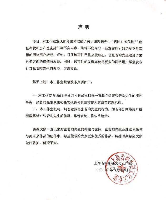 2020年6月,在媒体曝光“张若昀涉1.4亿财务纠纷”后,张若昀微博回应,“没签过约,未曾收钱。”同时,张若昀工作室也发布了如下声明称,“张若昀工作一直以来是独立运营,从未委托过第三方代理机构”。