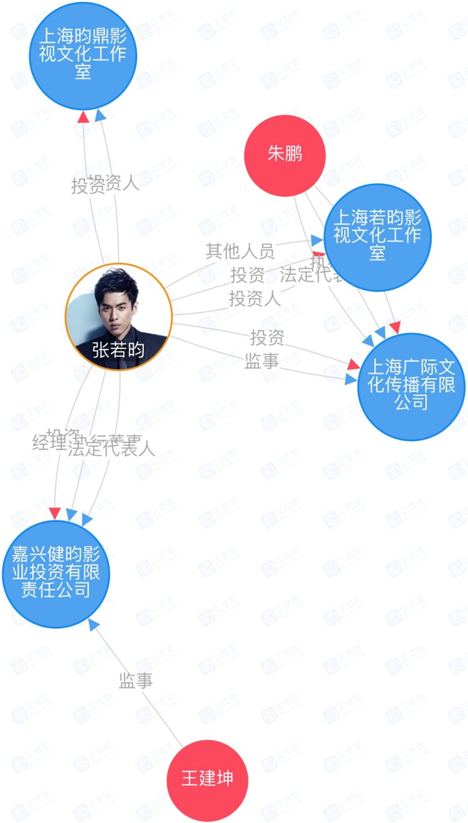 张若昀作为实控人,控股了4家公司,分别是上海若昀影视文化工作室、上海广际文化传播有限公司、上海昀鼎影视文化工作室和嘉兴健昀影业投资有限责任公司。