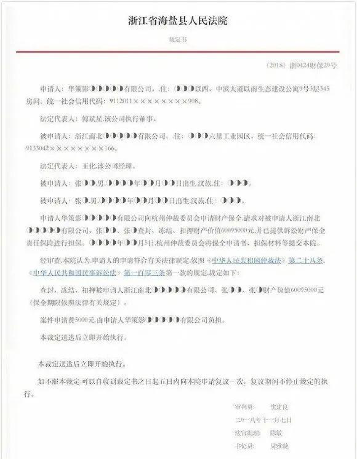 同年9月,浙江省海盐县人民法院裁定:查封、冻结被申请人梦都影业及连带责任人的银行存款1.55亿元或同等价值财产。