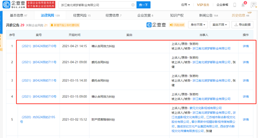 企查查数据,2021年3月15日,浙江省嘉兴市海盐县人民法院以“确认合同效力纠纷”为由,确立了张若昀上诉张健的案件,并于4月15日正式开庭。