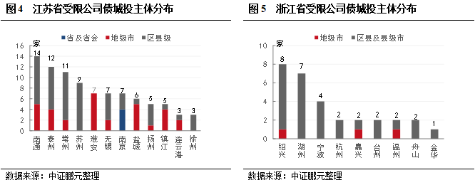 从城投平台地区来看,江苏、浙江、重庆、山东、四川等地受影响的平台数量高于其他地区,尤其江浙两地。以上五个省(直辖市)限借新还旧的平台数量分别为89家、30家、14家、13家、13家,此外还需审慎申报规模的平台数量分别为4家、3家、2家、2家和1家。仅江苏省内而言,南通(15家)、常州(12家)、泰州(11家)、苏州(9家)四地限借新还旧的平台数量较多,仅浙江省内而言,绍兴(8家)、湖州(7家)两地限借新还旧的平台数量较多,且均以区县级平台为主。