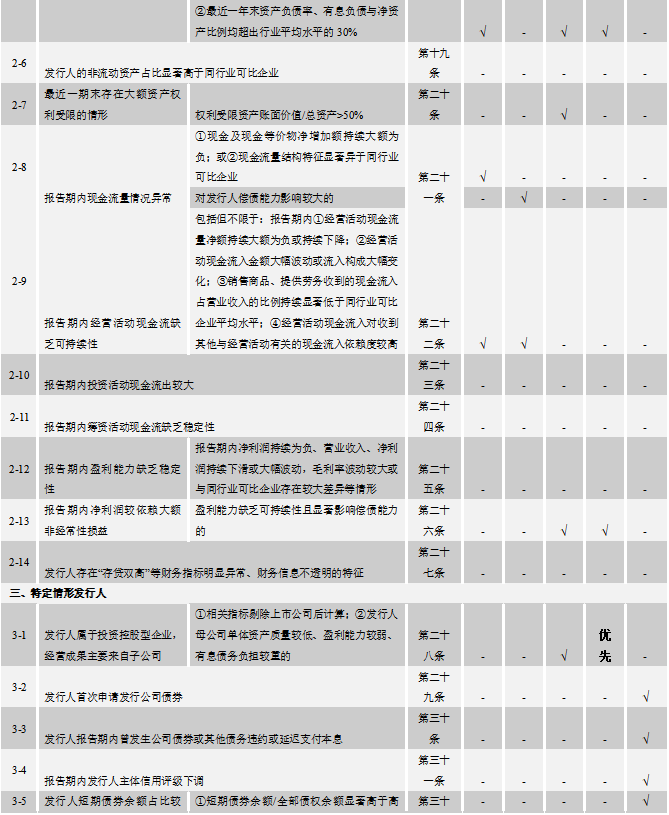 三是,特定类型发行人,具体包括“子强母弱”母公司主体、首次申请主体、历史违约或延期支付主体、评级下调主体、短期负债大且短期化明显主体、城投平台、房地产企业,以及会计处理存在重大无先例或争议的主体等八类。