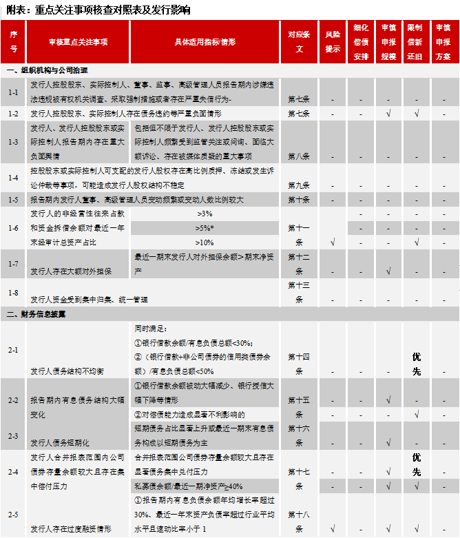 《指引》披露及审核要点:(1)组织机构与公司治理,重点关注发行人控股股东、实控人、董监高是否存在对偿债带来不利影响的因素,以及非经营占款、大额对外担保,资金归集管理等问题;(2)财务信息披露,重点关注发行人债务结构、短期偿债压力、集中偿债压力、流动性、资产变现及再融资能力、过度融资,以及现金流、盈利可持续性等财务指标异常情形;(3)8类特定类型发行人;(4)中介机构信息披露责任和核查职责履行。